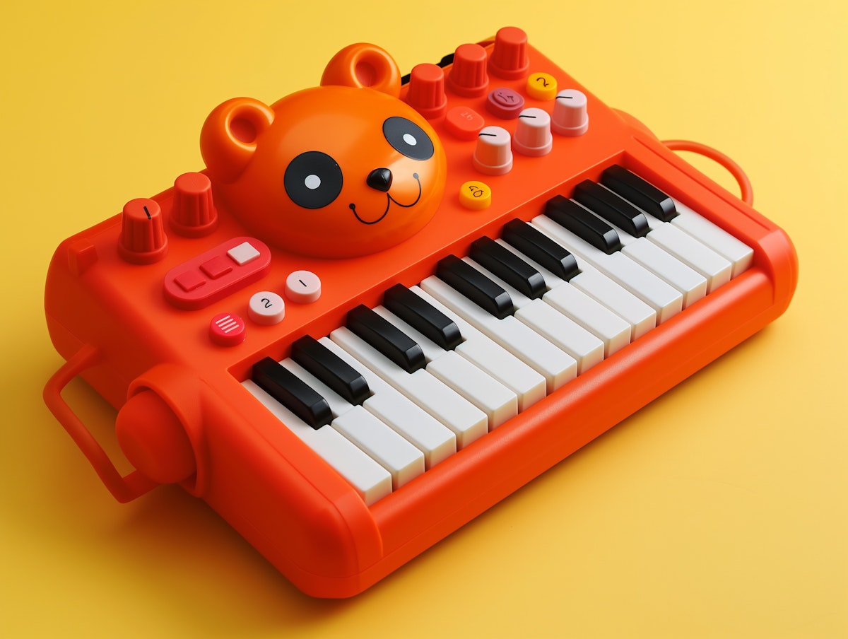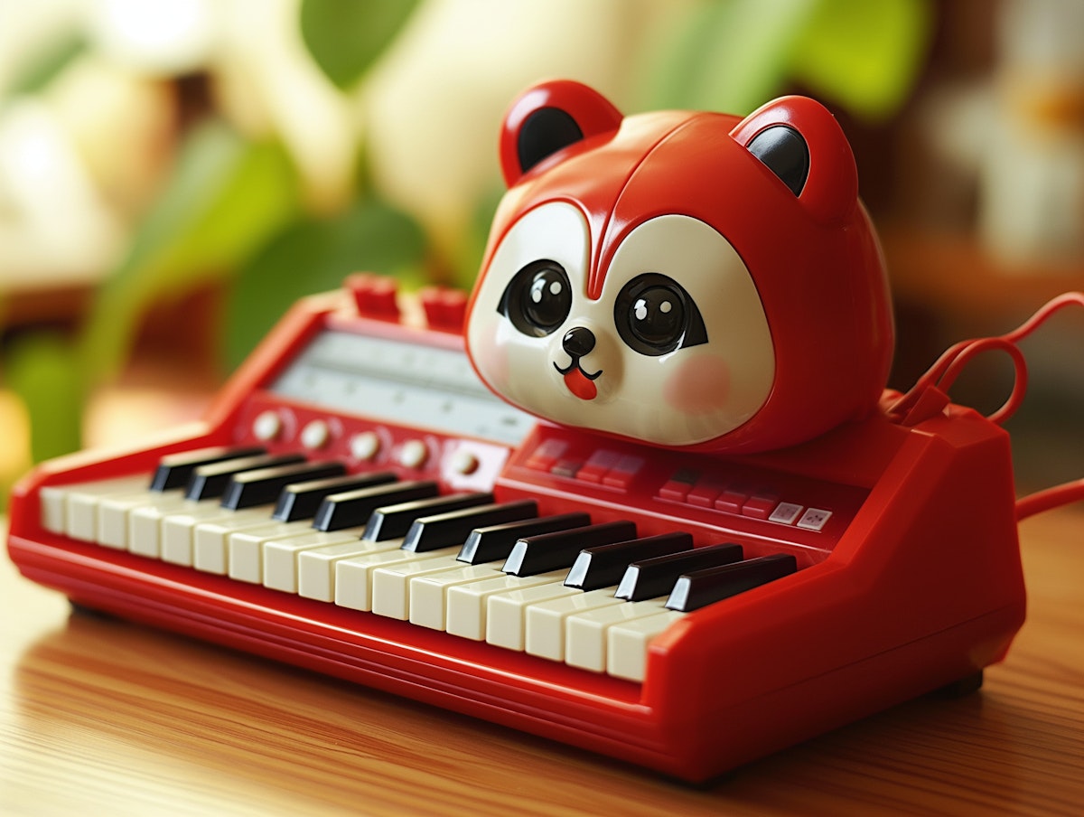 A kid-friendly electronic device designed to resemble both a musical synthesizer and a playful cartoon animal. The main body of the device is shaped like a bear's head with rounded ears and is red with accents of white and various shades of orange.