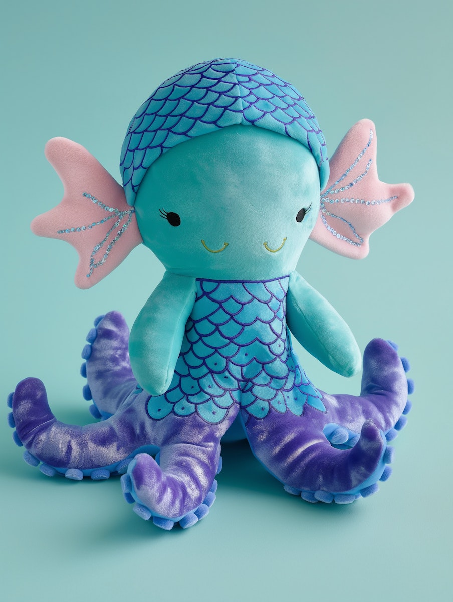 Toy designed to resemble a fantastical sea creature, potentially an octopus with elements of a mermaid. The main body of the toy is mint green, and it features charming details such as a smiling face with closed eyes and rosy cheeks