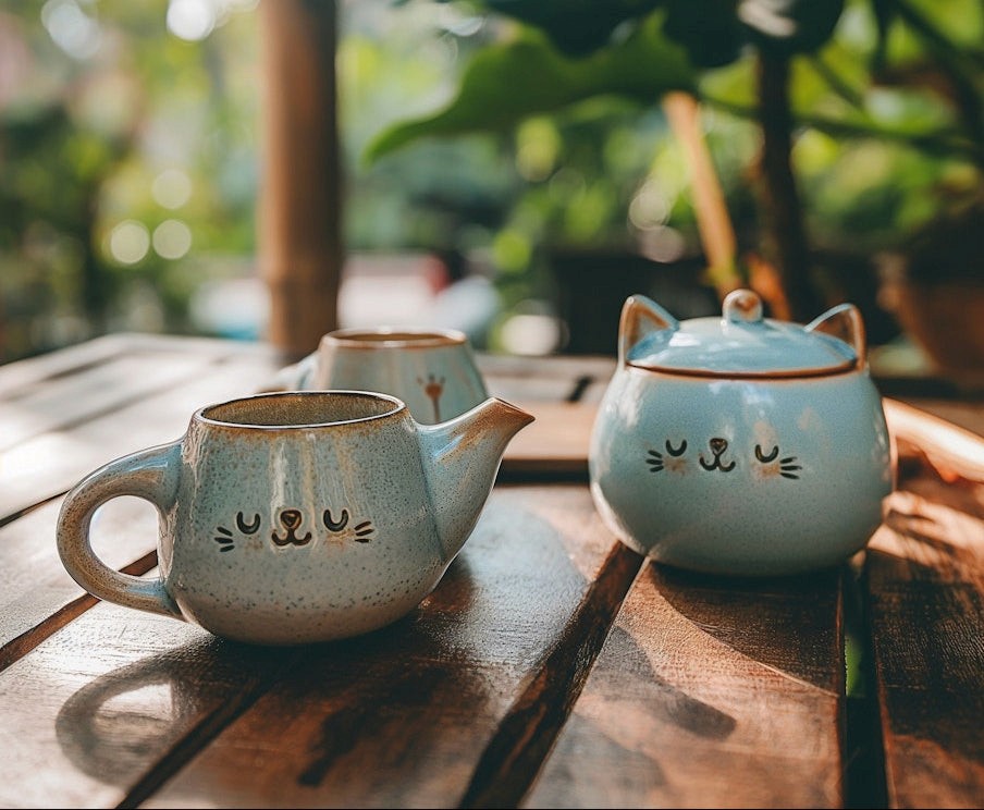 A charming and colorful collection of ceramic tea accessories, including a large teapot and smaller items resembling cats, all adorned with cheerful, cartoon-like faces. The main teapot, prominently displayed, showcases a light blue color with a cute, smiling face design.