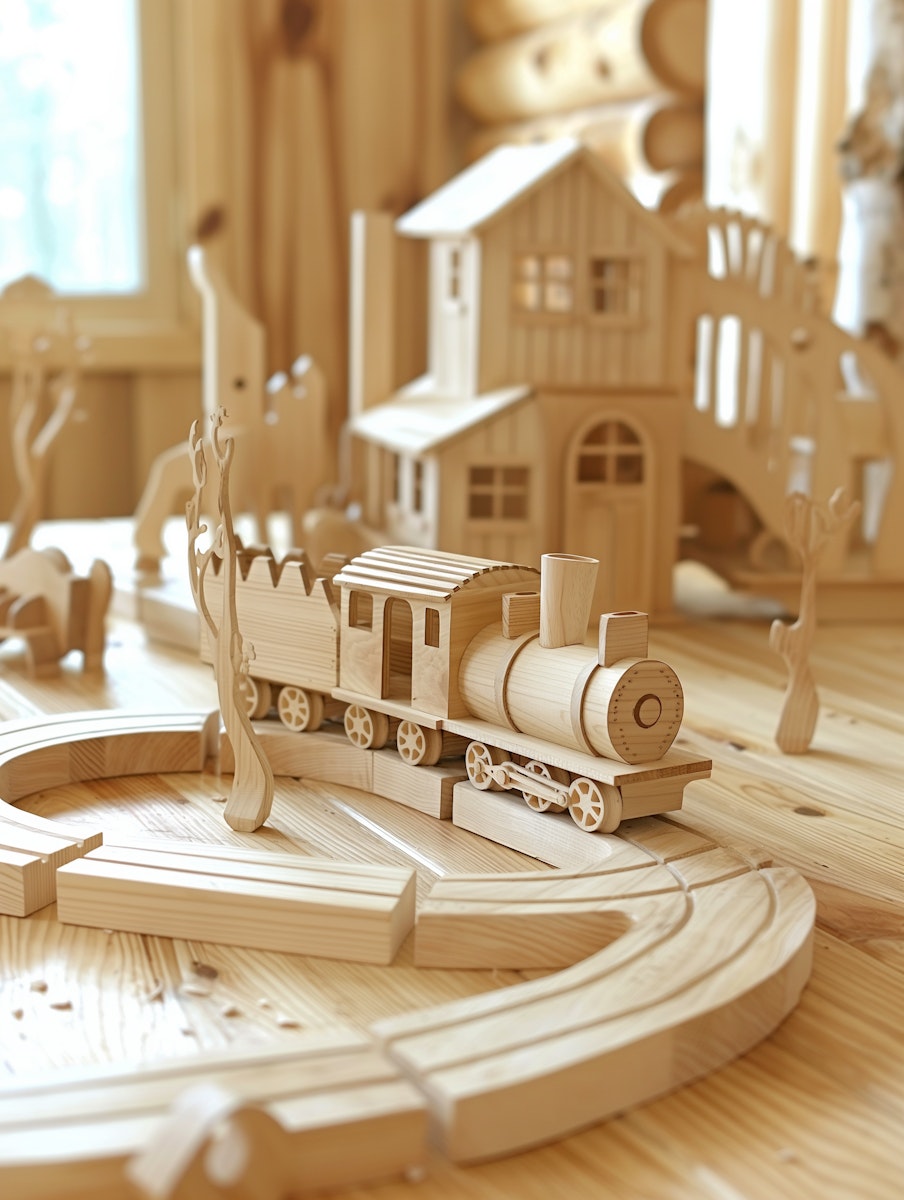The train, crafted from natural wood, consists of several sections including a locomotive and passenger or cargo cars, showcasing fine craftsmanship with details such as rounded edges and small wooden pegs as connectors.